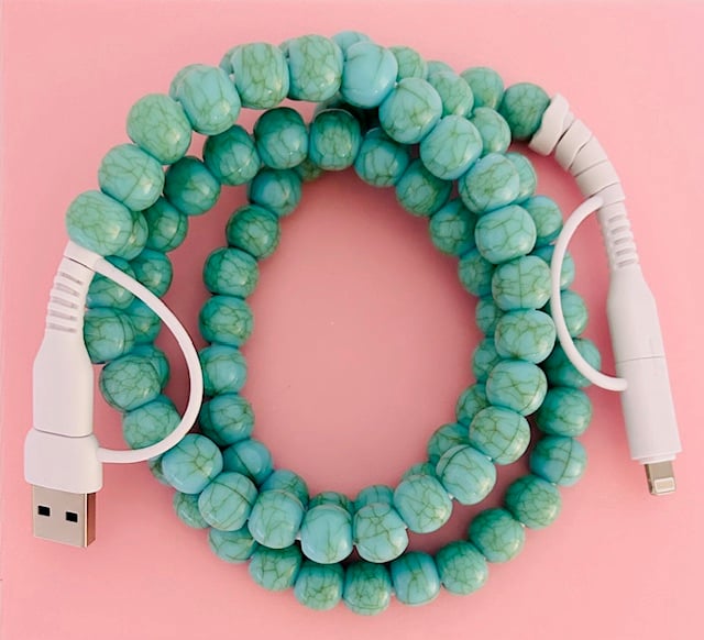 This shiny light Turquoise beaded charging cable is so much fun to use! Speedy charging and chic! Compatible with all devices. 4 in 1 charging. No one will mistake your charger as theirs.