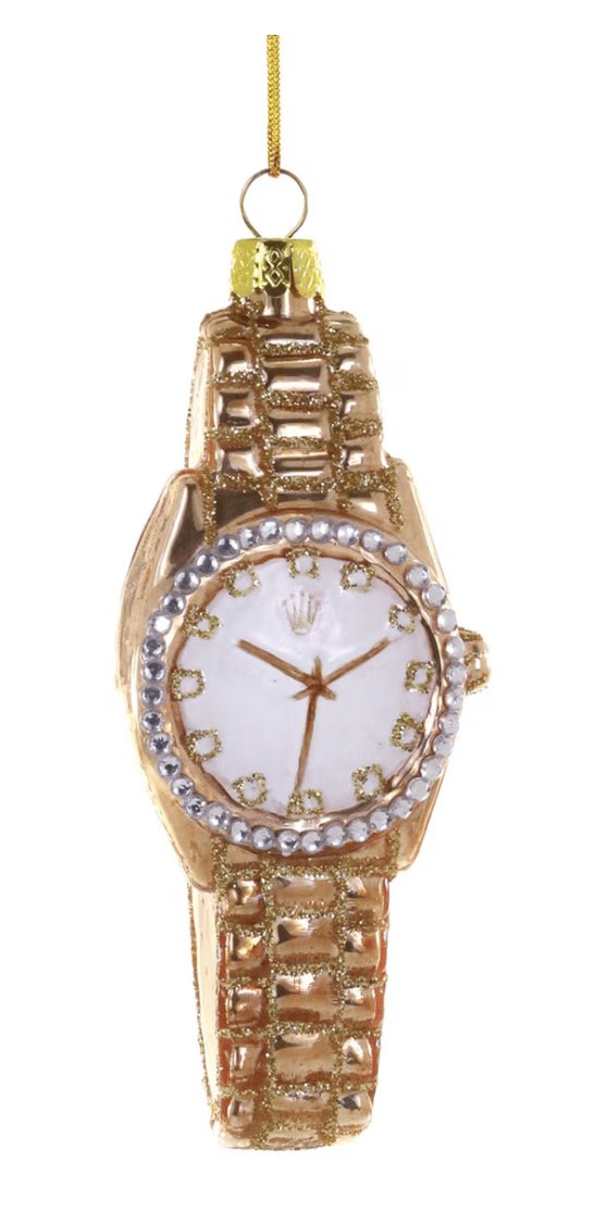 The perfect gift for the Rolex lover. Glamorous in gold and made of glass this luxe ornament measures 1.75" X 1.25" X 4". It's Christmas time!⌚︎