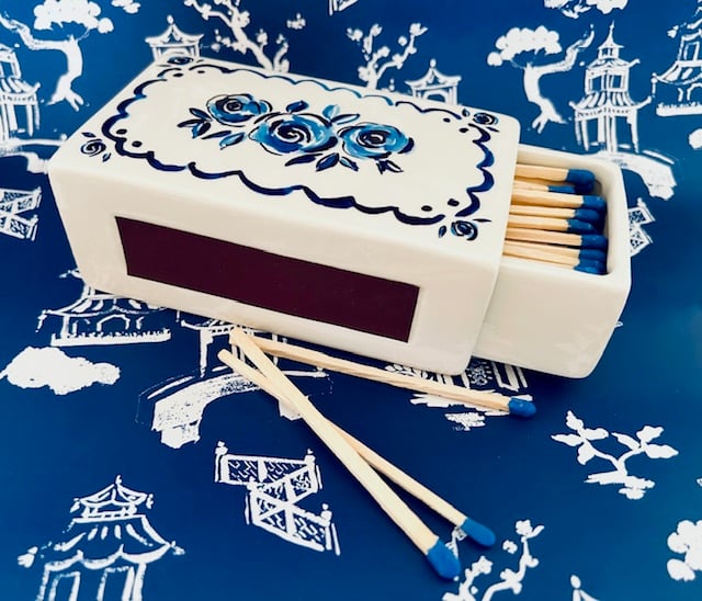 Elevate your coffee table or kitchen with this fabulous Blue Flowers Ceramic Matchbox! It measures 2" H x 3" W x 5" D and contains 75- 80 blue tipped matches. A cute gift for Mother's Day!