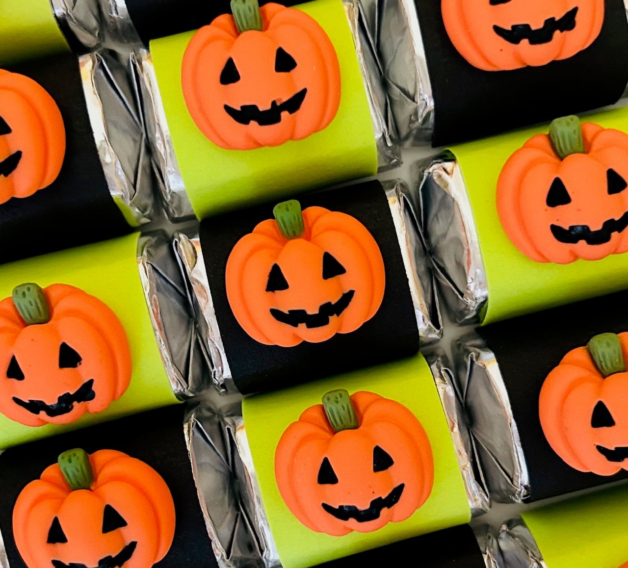 These adorable pumpkin nuggets are the perfect addition to your Halloween party! Orange pumpkins adorn lime and black card stock wrapped around a chocolate nugget, YUM! We Jack-0-Lanterns.🎃