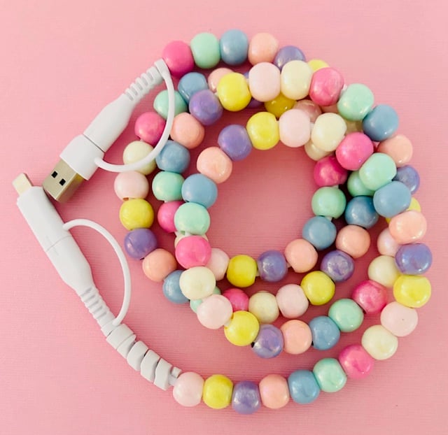 This shiny pastel beaded charging cable is so much fun to use! Speedy charging and chic! Compatible with all devices. 4 in 1 charging. Perfect in an Easter Basket! No one will mistake your charger as theirs. ๐ฉท๐๐๐งก๐ฉต
