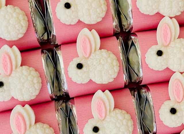 These adorable white bunnies are sure to please. White bouclé bunnies adorn pink textured card stock wrapped around a chocolate nugget, YUM! Perfect in an Easter basket! Adorbs.🐰